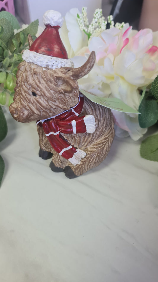 Sitting Highland Cow with Hat & Scarf