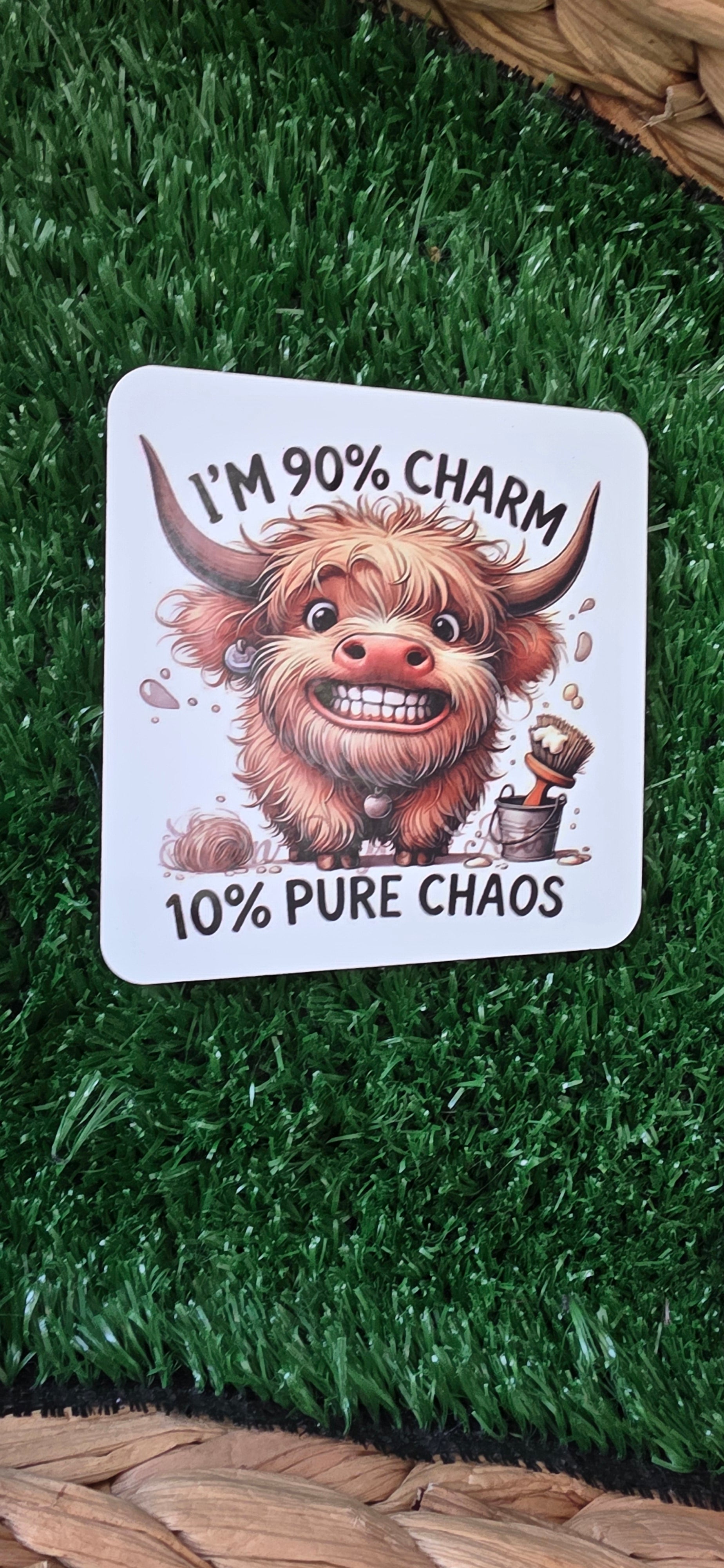 MDF cork backed coaster with a humour image and wording reading "I'm 90% Charm, 10% pure chaos".