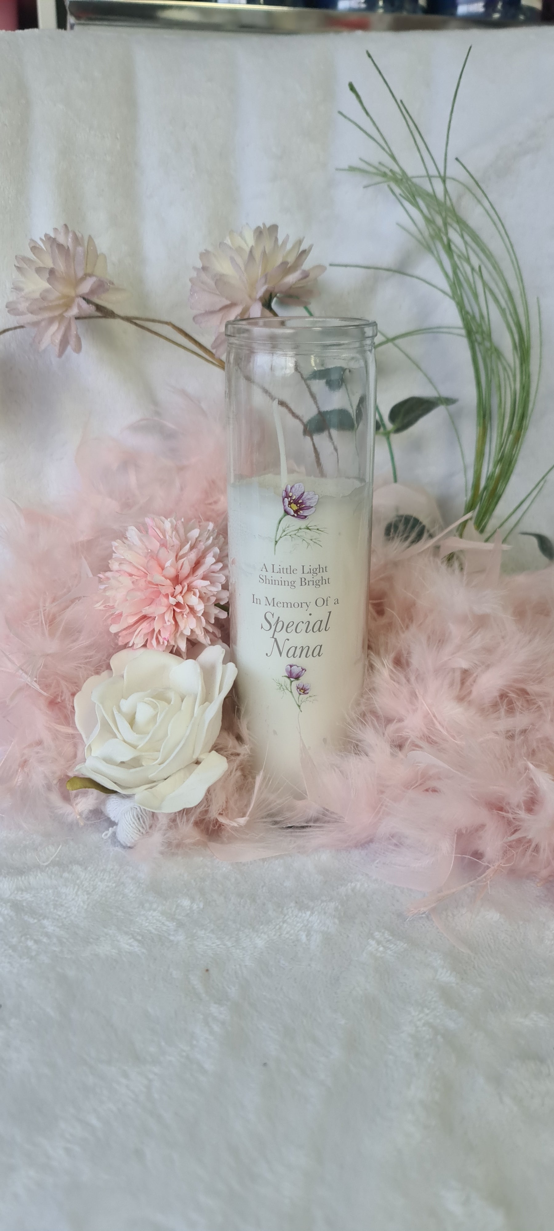 Tall Glass candle reading" A Little Light Shining Bright in memory of a SPECAIL NANA" with a floral design above and below.