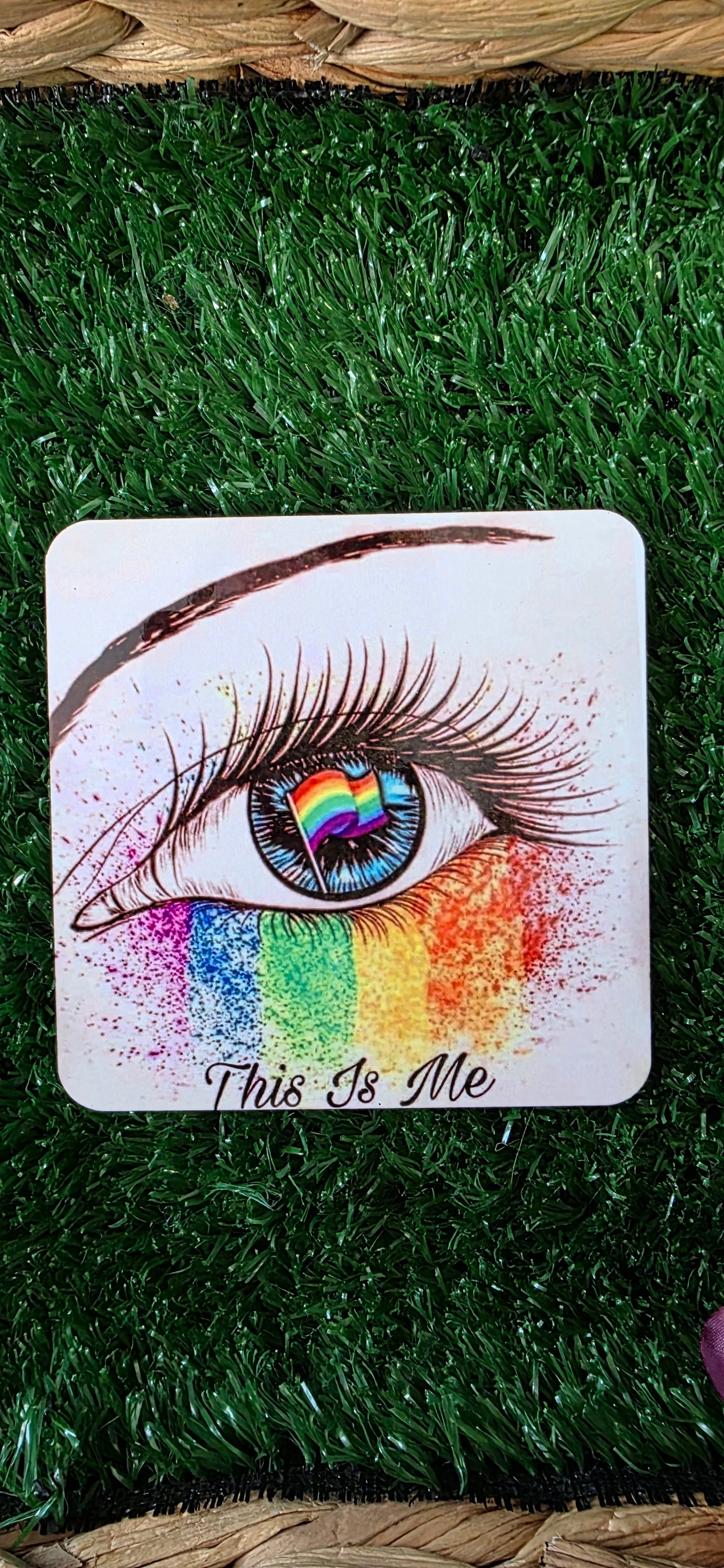 MDF cork backed coaster with a image of a eye with a pride flag in the pupiland wording reading "This is me".