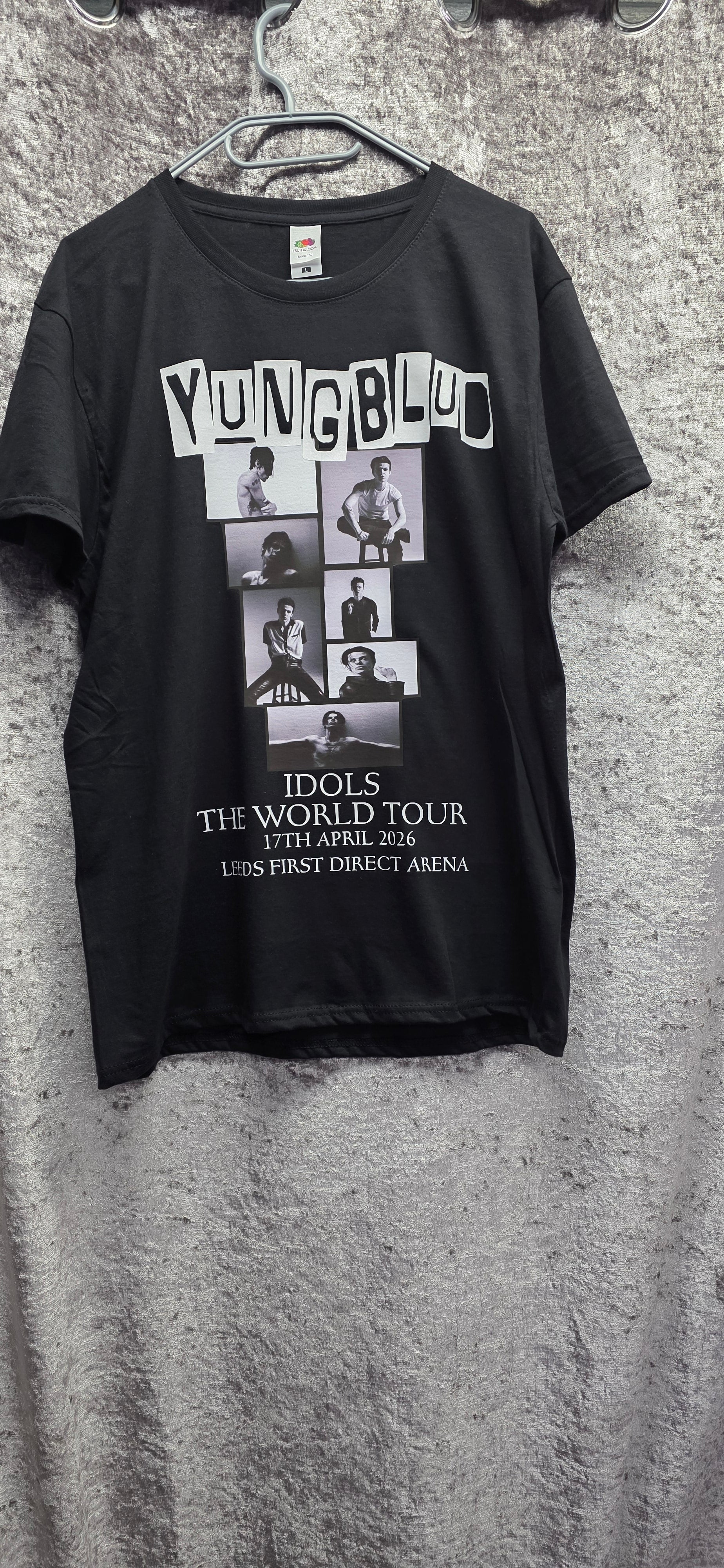 Black T-shirt with our exclusively designed Yungblud printed emblem design. Containing various poses of Youngblud. Can be plain or Personalised with your chosen date and venue.